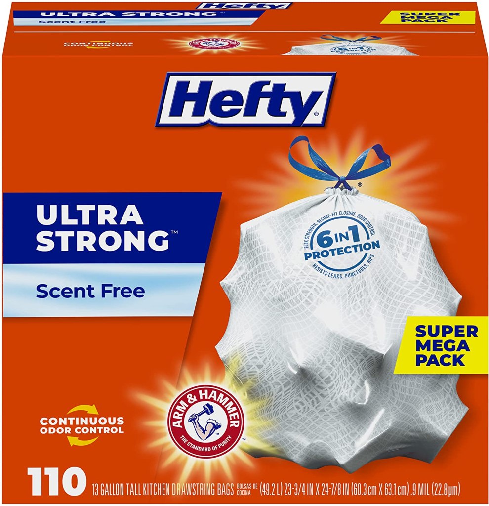 - 13 GALLON GARBAGE BAGS—This package contains 110 Hefty Ultra Strong, unscented, 13 gallon trash bags