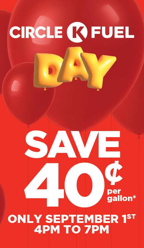 On 9/1, Circle K Fuel is dropping the price on fuel by 40 cents per gallon from 4-7pm at participating stores