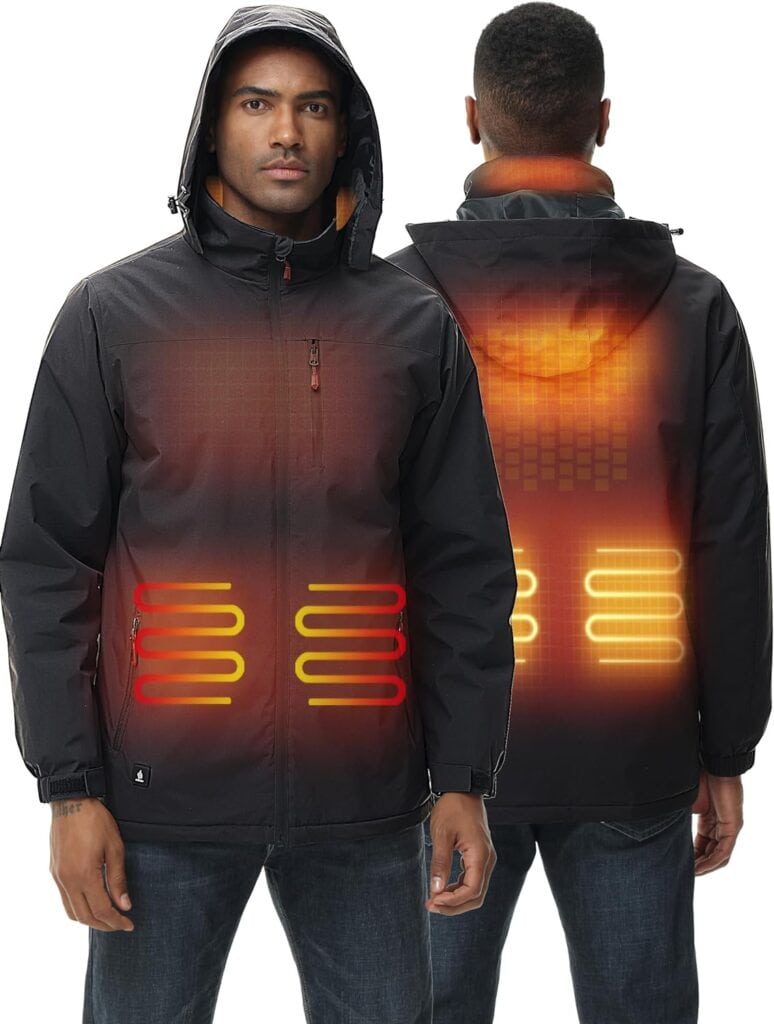 This jacket is made for outdoor winter activities. Whether you work outdoors or are nature inclined, even on cold days, this heated jacket is ready to bundle you up in a warm hug. It has six different heating sources, each one geared to warm key core areas. Up to 10 hours of run time!