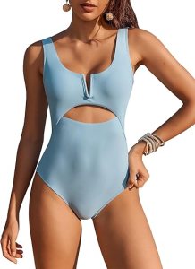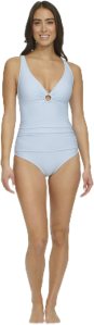 This one-piece is as flattering as they come. It has a sleek style and a dash of “sexy” with its stylish v-neck and trendy cutout. The swimsuit, available in a variety of colors, offers a fun twist on a classic silhouette.
