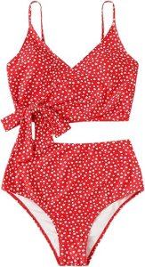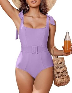If you want a bikini that screams “chic,” then look no further. This one-piece is up for the challenge. The suit is adorned with delicate bow-tie shoulders and an adjustable belt that will highlight your curves. The buckle pairs well with the bows, adding some dimension and elegance to your look.