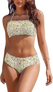Who doesn’t adore a floral flourish? With this twist-front bikini top and tie-side bottom, you’ll be turning heads in no time. The unique pattern imbues it with an air of distinctiveness, and the removable padded cups add to your comfort. Whether you’re set for a sultry summer, a tropical vacation, or a beachy honeymoon, this bikini’s got you covered – literally!