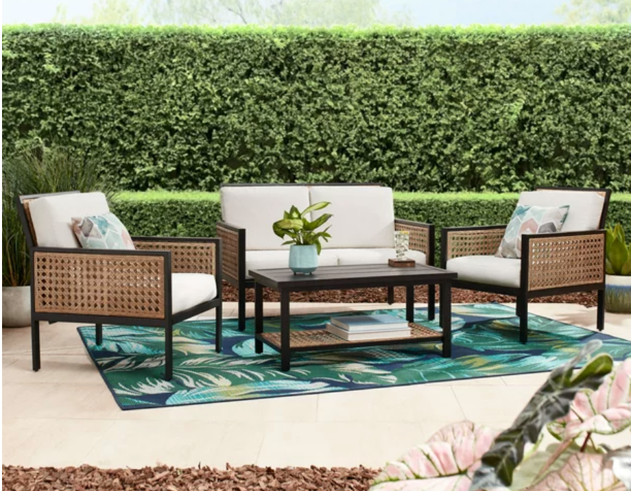 - 4-piece cane weave set includes 2 chairs, loveseat, and coffee table