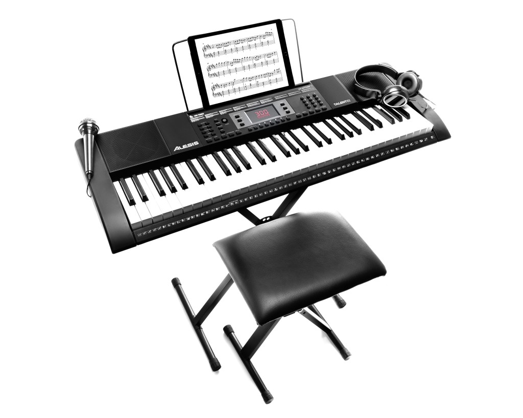 - Everything you need – easy-to-assemble stand, a bench with three adjustable height settings, headphones, a music rest, a power adapter and a microphone for singing along while you play