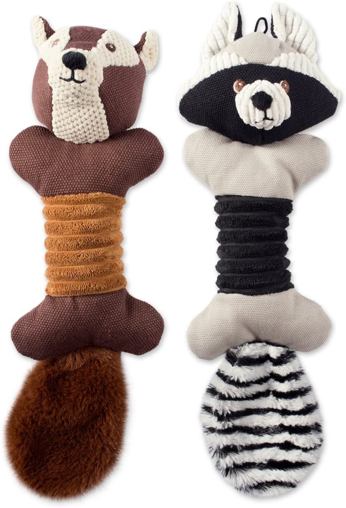 - This set of 2 soft bone body dog toys are each 14.5″(Squirrel) and 15″(Raccoon) in length, perfect for small, medium and large dog.