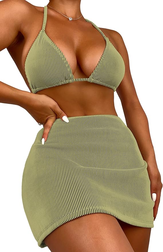 This bikini set is a 3-piece combo: a classic bikini top (sans underwire), a cheeky bottom that shows off your thighs, and a high waisted skirt you can easily slip on and off. It’s a unique design ready for different styling needs.
