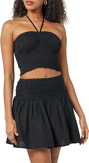 That halter top would pair well with this skirt. It has a cinched waist, so it gives a little as you move. And it makes a great staple piece that you can mix and match the rest of your summer wardrobe with.