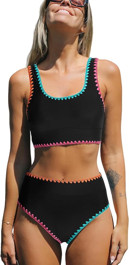 via AmazonCupshe’s 2-piece bikini set offers a little more coverage than the average bikini. But it definitely isn’t boring! It’s a sporty fit that is so comfortable to wear, then perfectly matched with some colorful stitching. It really is the whole bathing suit package.
