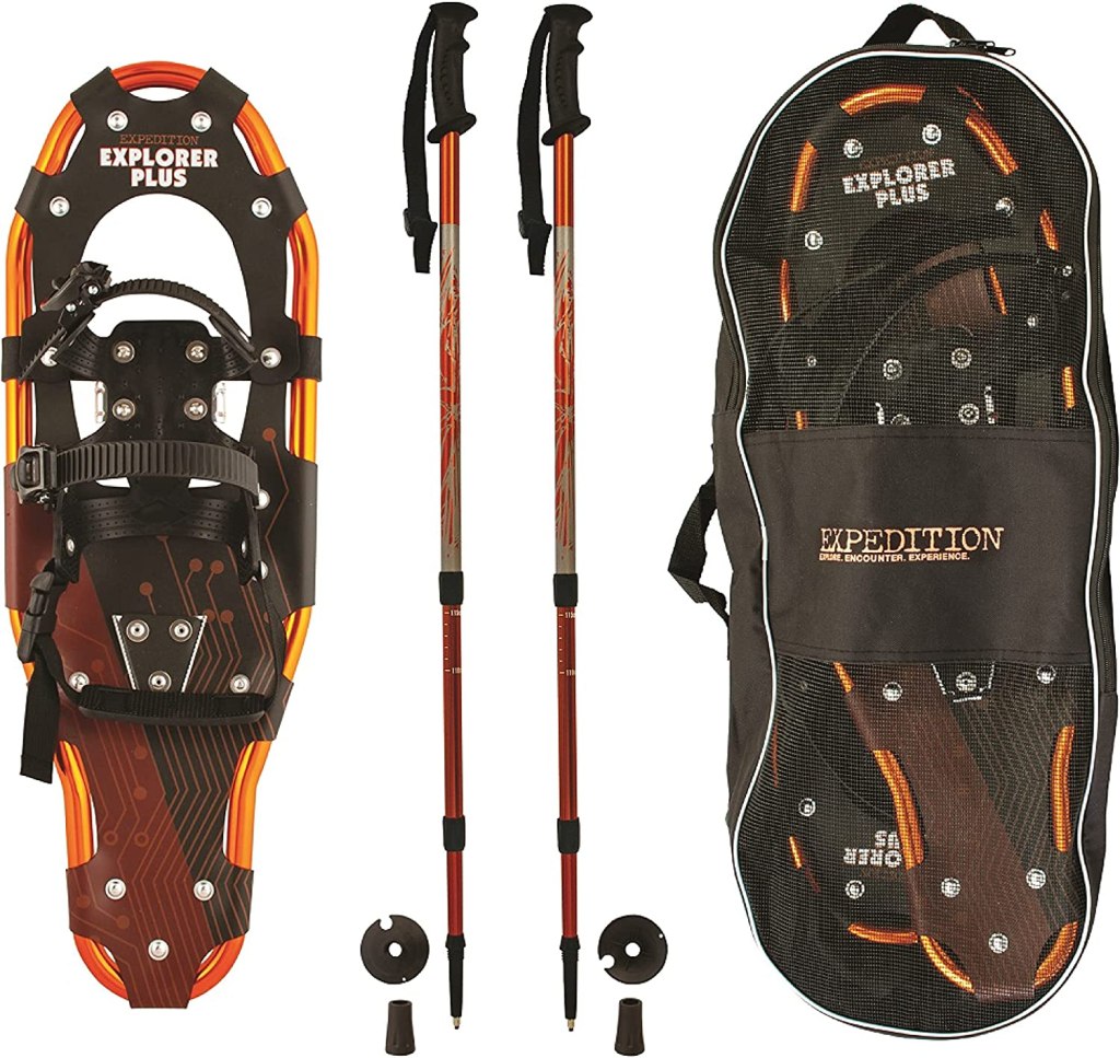 - Explorer Plus Snow Trail Kit is perfect for snowshoe beginner adults and includes: 1 pair aluminum twist-lock trekking poles; 1 pair trekking pole snow baskets; 1 pair trekking pole rubber tips; 1 Cordura travel bag featuring Air Dry Mesh