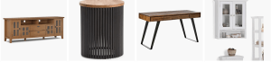 - Features a large centrally located open area with one (1) flip down drawer, one (1) pull out drawer as well as four (4) storage spaces with tempered glass doors
