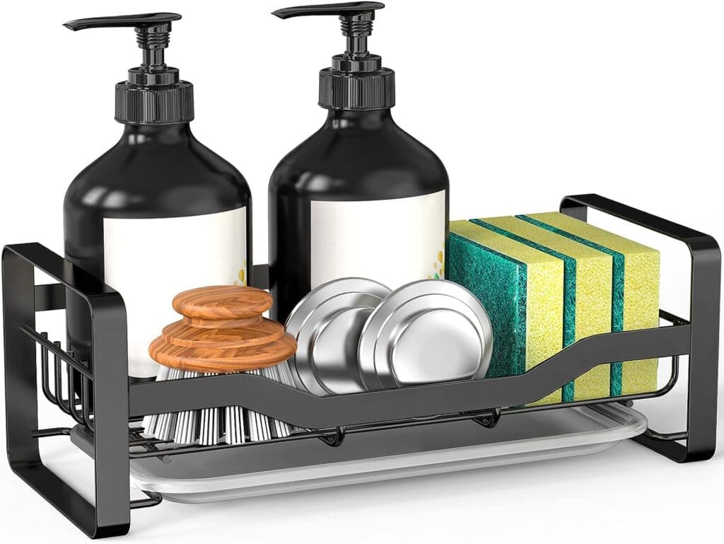 Keep your kitchen organized with this sink caddy! With a larger capacity and improved dimensions, it offers more storage space. The removable drain pan keeps your countertop dry. Made of durable stainless steel, it’s rustproof and easy to clean. Perfect for kitchen, bathroom, or garage use.