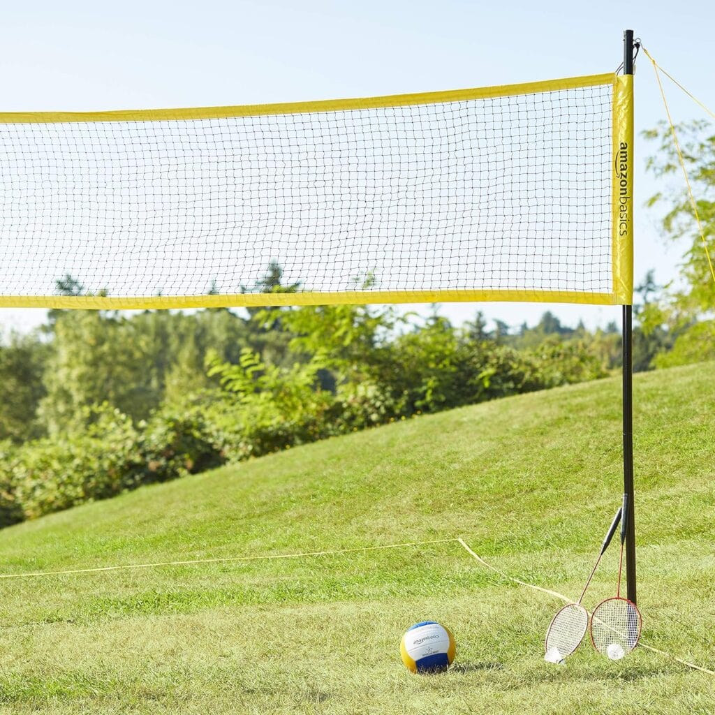 Elevate your outdoor fun with this Amazon Basics set. It includes everything you need for a thrilling match: net, poles, racquets, birdies or shuttlecocks, and a ball. And when the game is over, simply pack it all up in the durable carrying case. With heavy-duty powder-coated poles and a premium PE net, this set is built to withstand intense play and outdoor conditions.