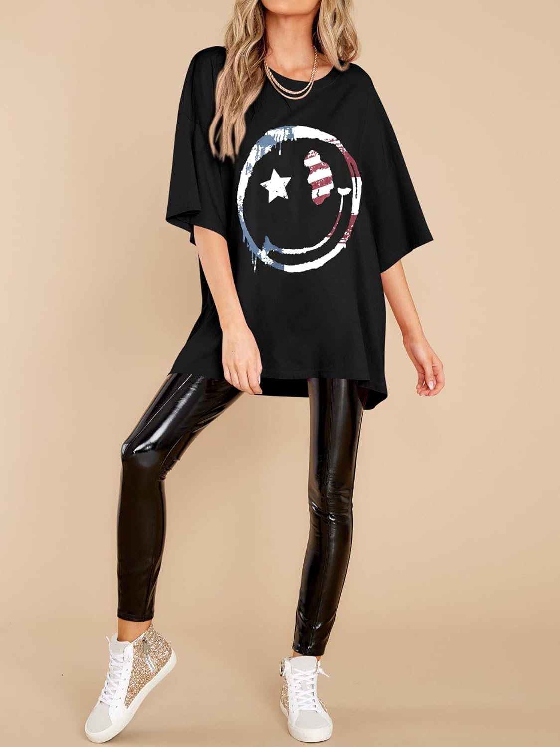 The WLLW Women’s Drop Shoulder Oversized Graphic Tee beams patriotism with a smiley face in red, white, and blue. It’s like wearing the Fourth of July on your chest, perfect for those who bleed freedom and want their fashion to shout it loud and proud.
